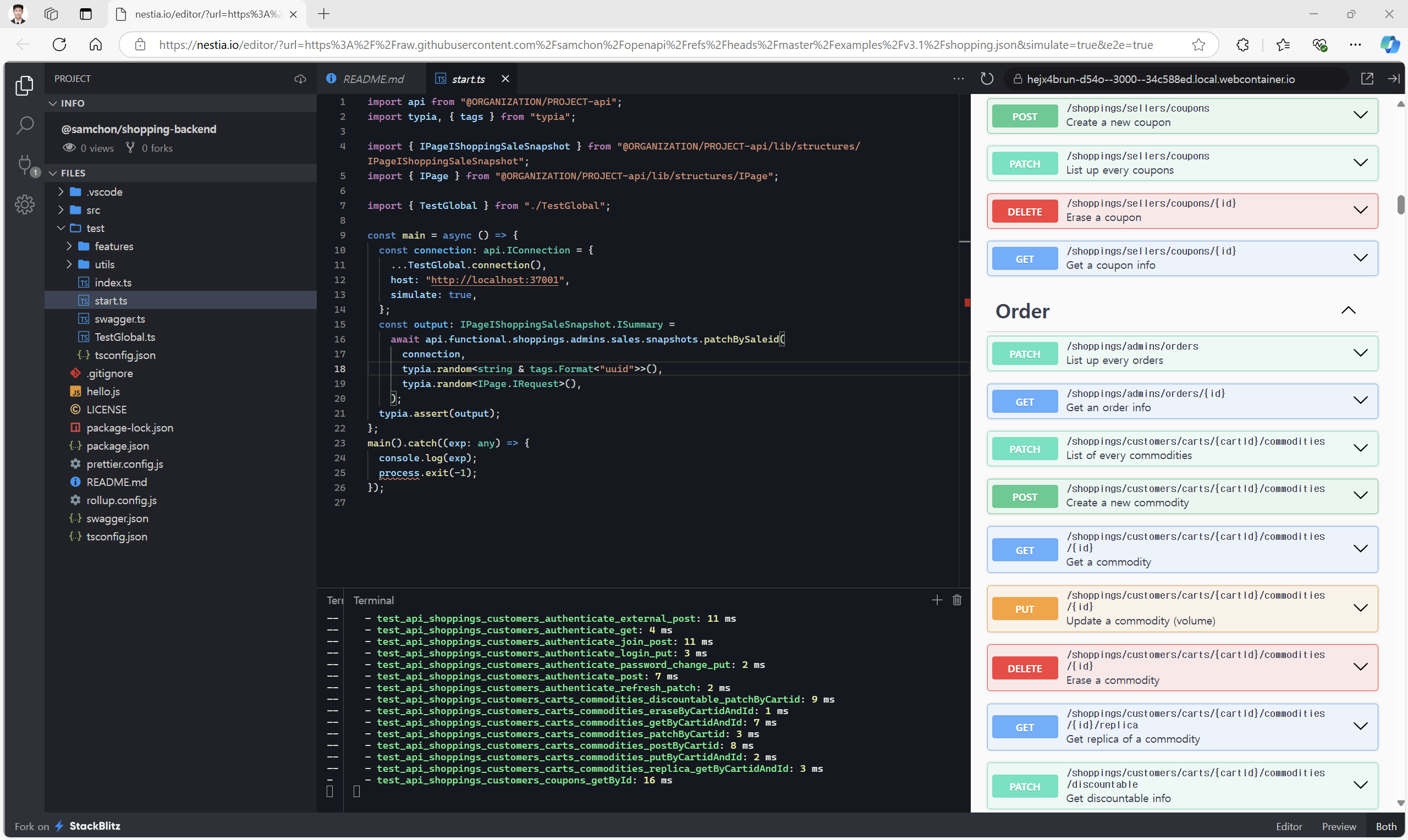 “TypeScript Swagger Editor” is a web-based TypeScript editor (of StackBlitz ) for Swagger API (OpenAPI) specifications, with SDK (Software Development Kit) library generated by nestia. It generates SDK types, functions and mockup simulator by analyzing content of the input swagger.json file.