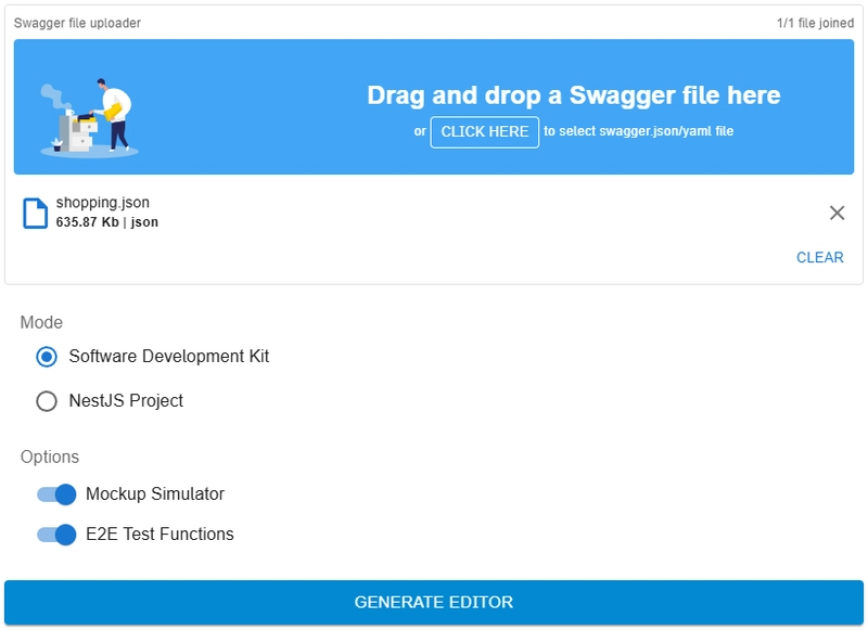 If you use any other language or framework: upload your swagger.json to Nestia Editor . It generates the same typed SDK with Mockup Simulator included — language of the original backend does not matter.